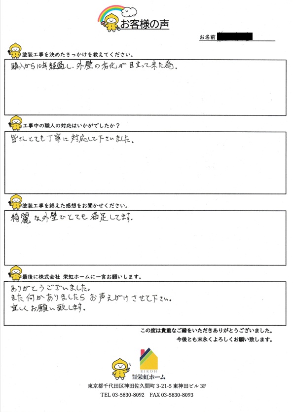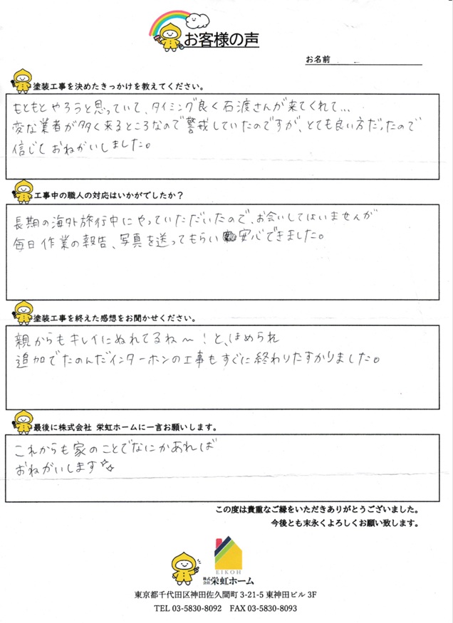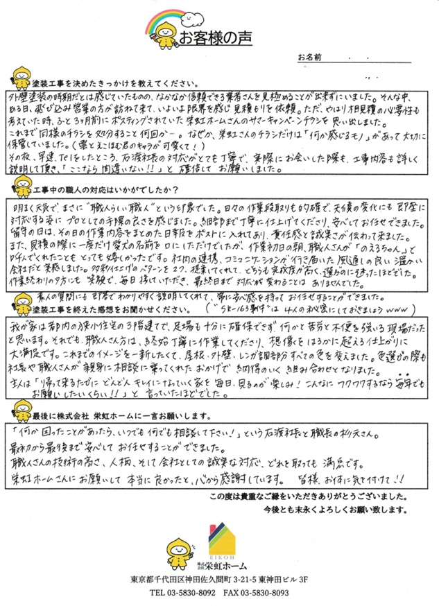 見積りをとった際に石渡さんより様々な塗料の種類、方法、価格、それぞれのメリットデメリットを説明していただき、丁寧な対応を受け、総合的に見て良心的な価格であったこと、安心してお願いできると確信を持てたのでお願いする事に決めました。